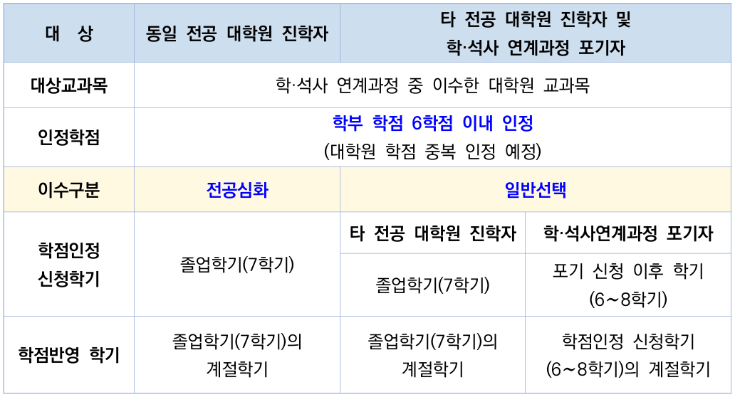 3. 신청대상: 학·석사 연계과정 학부생 중 대학원 교과목을 이수한 졸업대상자 및 연계과정 포기자